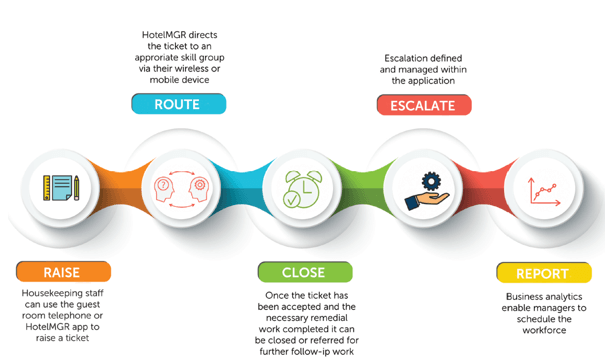 Once the issue is raised, HotelMGR directs a ticket to the appropriate person to deal with it. Should a manager need to be involved, staff can escalate the ticket to the appropriate person.