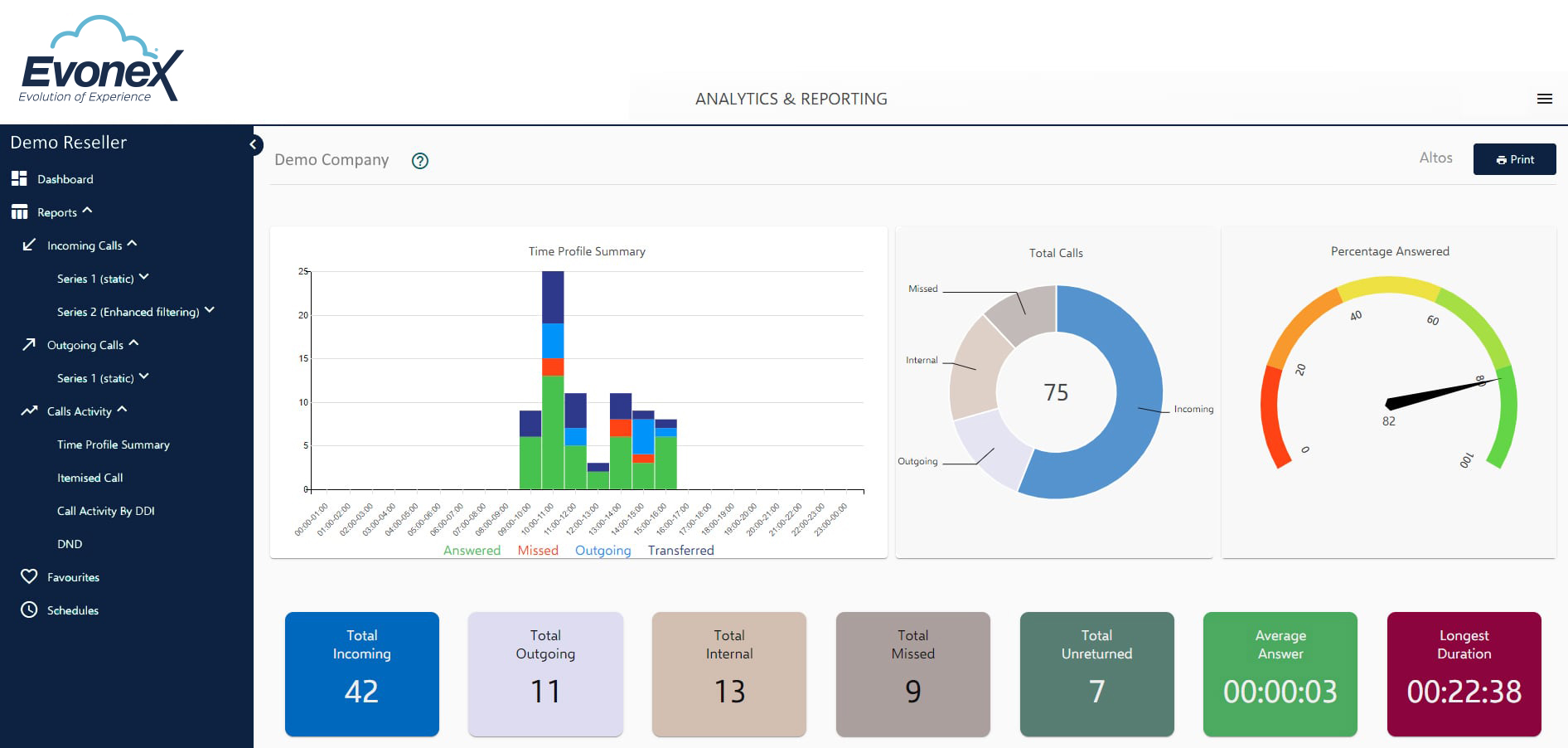Benefit from comprehensive statistical reporting at call group and individual DDI level with informative charts and graphs to help monitor and manage your communications. Use filters to create and save your favourites, schedule reports via email to colleagues or download and print for reference.